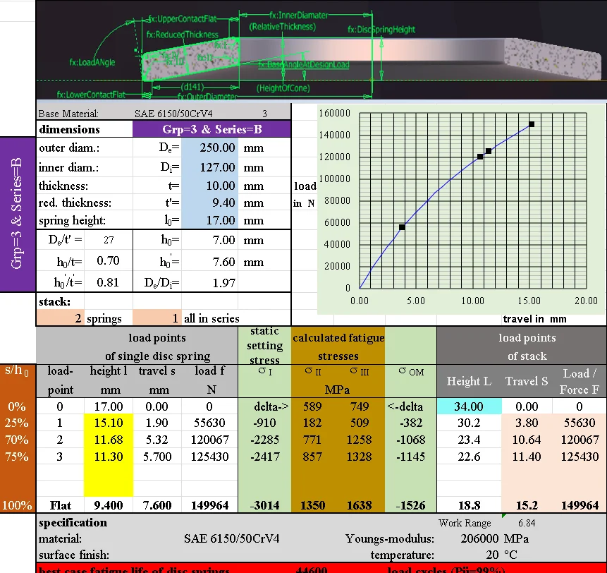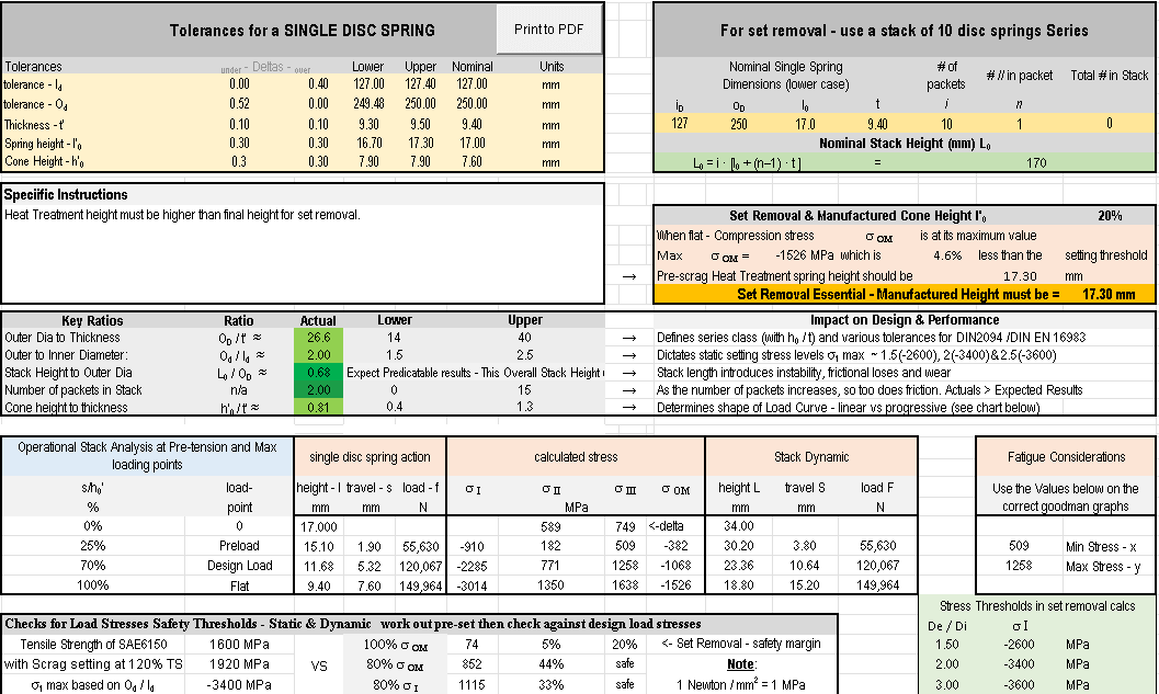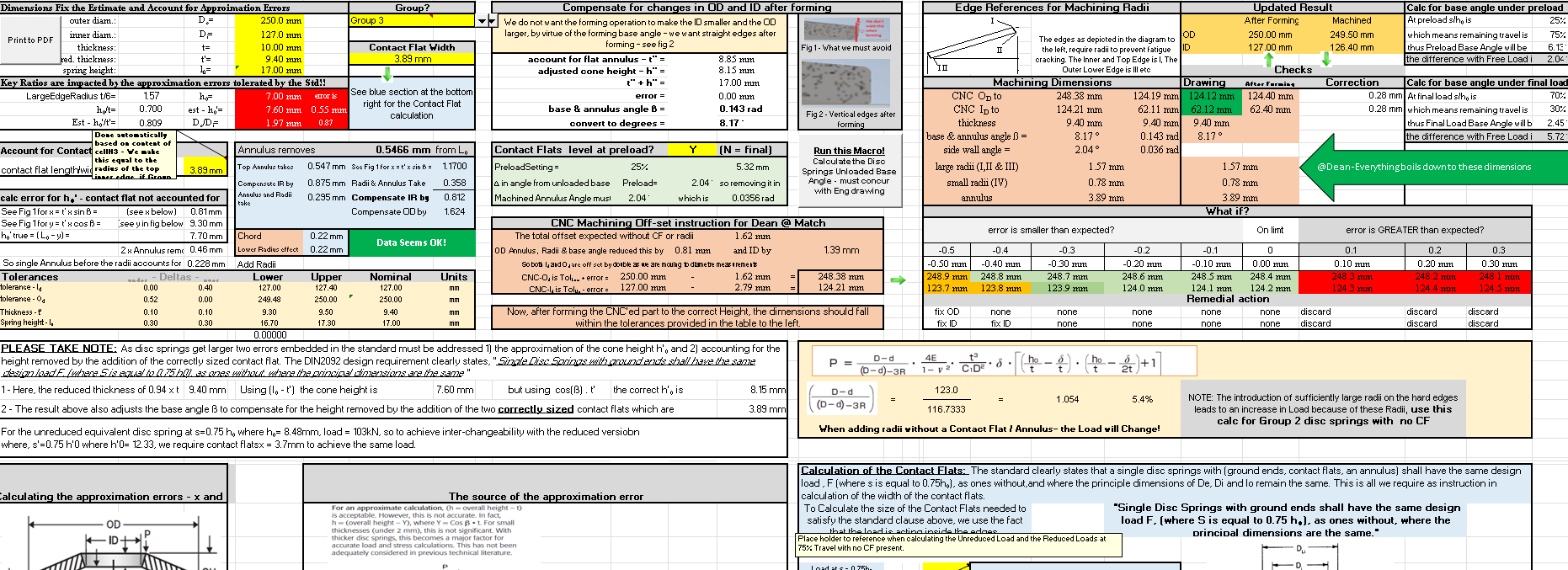 All of this information goes into the jobcard pack that accompanies the quality assurance pack through the manufacturing process. We have a specific page dedicated to design verification. As part of our ISO9001:2015 Quality Management System, we generate a Disc Spring Design with all the necessary properties that you can expect from both the individual disc spring as well as the stack in whatever configuration you will be using it, Here's an example.. Our results may differ from most other manufactures because we use an updated method for calaculating the contact surface/annulus dimension. This is extremely important for disc springs with De greater than 150mm. Even more importantly, especially where disc springs are used in a stack configuartion, we account for friction in our stack designs.